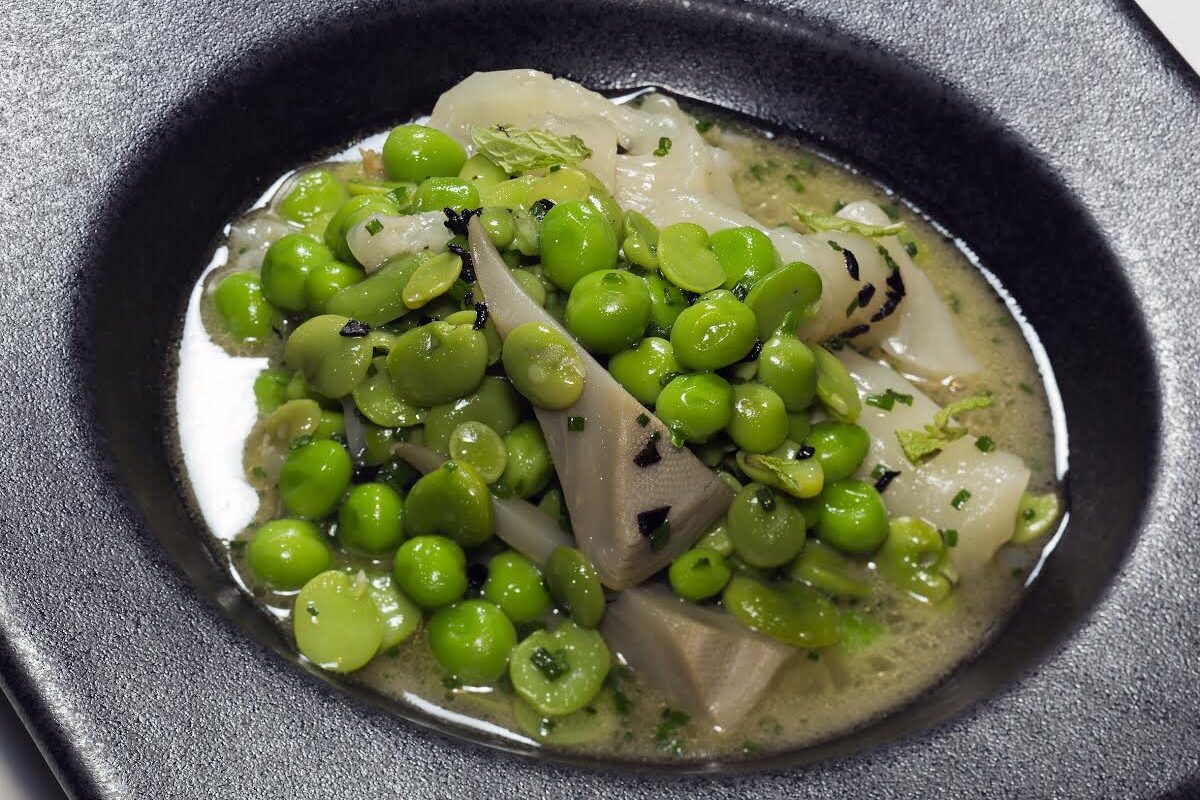 Saltear las alcachofas cuarteadas, añadir tripa de bacalao en trozos grandes, las habas, los guisantes y mojar con la infusión de guisantes.